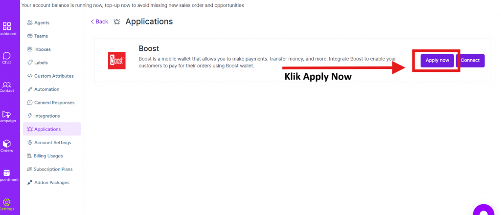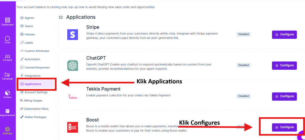 3. Klik pada Application. Scroll ke bawah sehingga jumpa application BOOST. Klik Configure. Rujuk gambar di bawah.