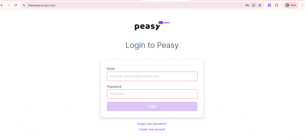 1. Anda perlu login menggunakan Desktop di https://chat.peasy.ai. Masukkan username dan password anda dan klik butang “Login”.
