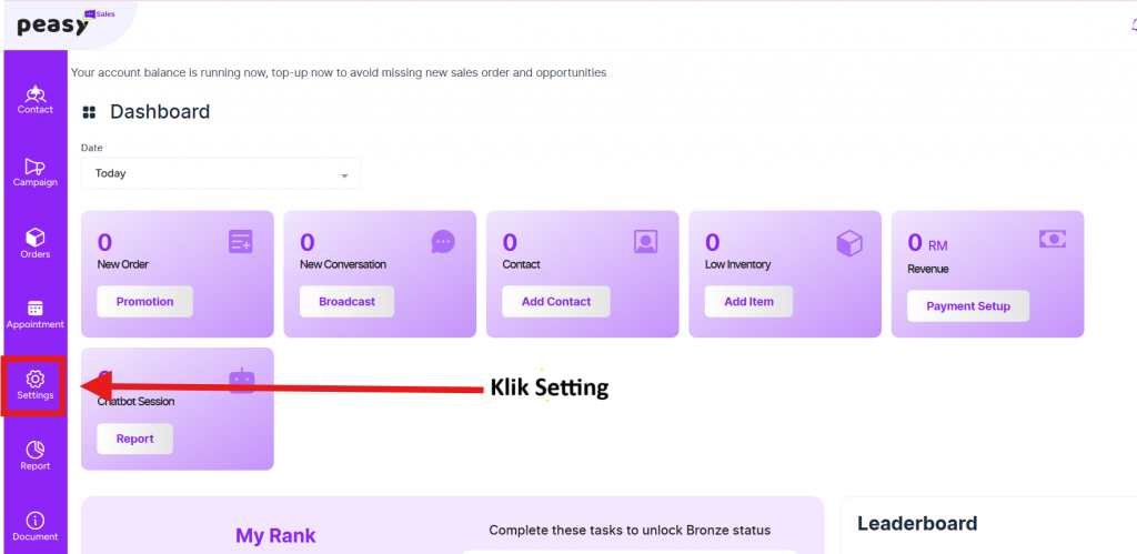 2. Lihat di sidebar. Klik pada setting. Rujuk gambar di bawah.